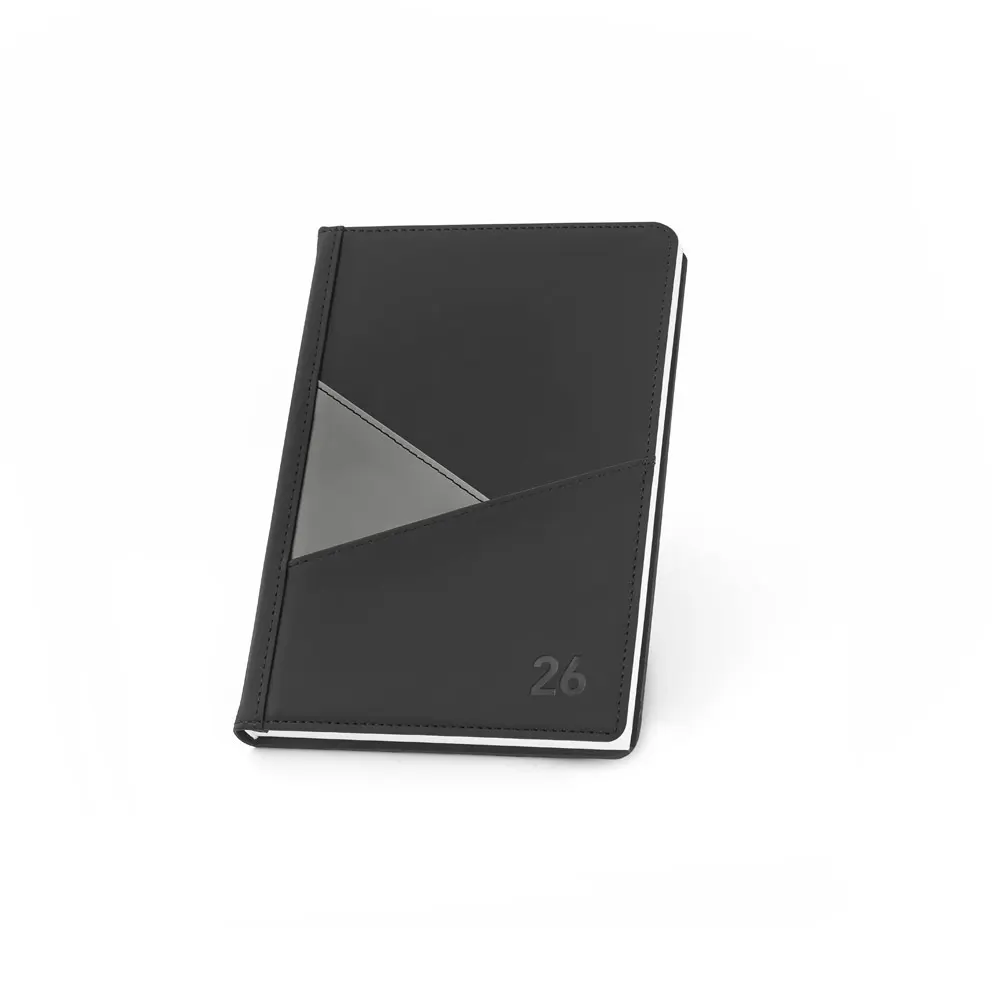 Agenda A5 em PU. Possui 2 bolsos exteriores na capa para guardar pequenos objetos e um marcador em fita. Está organizada num plano diário. 148 x 210 mm