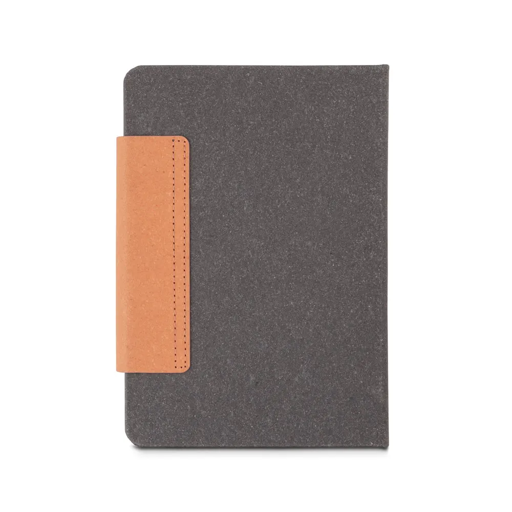 Agenda B5 em pele reciclada (58%) com fecho magnético. Está organizada num plano semanal. Inclui suporte para esferográfica (incluída) e marcador em fita. Fornecida com bolsa de non-woven. 175 x 245 mm | Bolsa: 220 x 270 mm