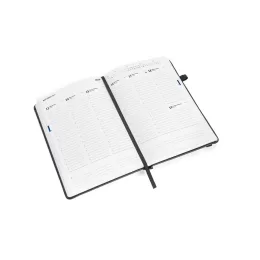 Agenda B5 em PU à base de água. Inclui um suporte para esferográfica (não inclusa), marcador em fita e um elástico para fechamento da agenda. Está organizada em plano semanal. 175 x 245 mm