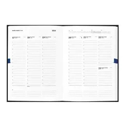 Agenda B5 com capa rígida em papel pedra e marcador em fita, com aspeto mármore e cantos retos. Está organizada num plano semanal. 175 x 245 mm