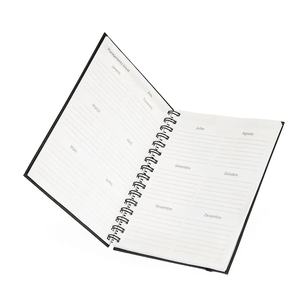 Descrição: Agenda diária 2026 com capa em couro sintético e marca-páginas em fita de cetim. Contém páginas dedicadas para dados pessoais, calendários de 2025 a 2027, lista de contatos, planejamento e mapas.
