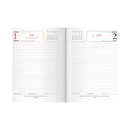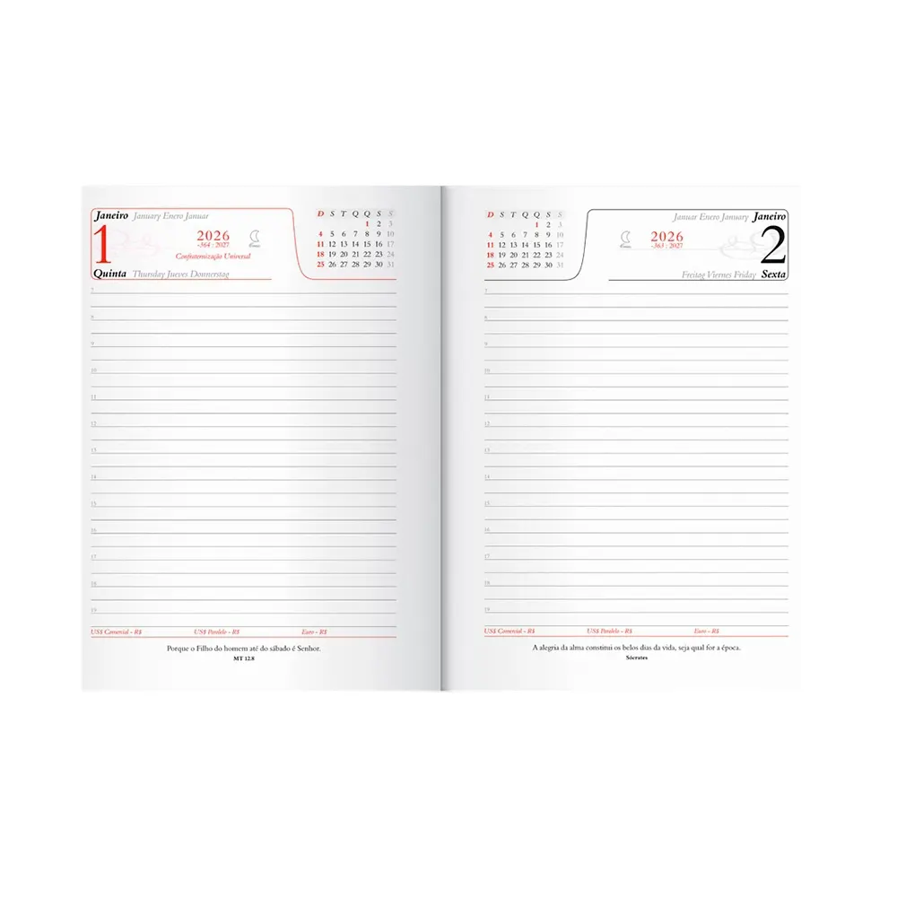 Descrição: Agenda diária 2026 com capa em linho com detalhe em metal, marca-páginas feito em cetim, porta-canetas lateral e fechamento em elástico. Possui páginas para planejamento mensal, calendários de 2026 a 2028, além de listas de conversão de pesos e medidas, contatos e códigos DDI.