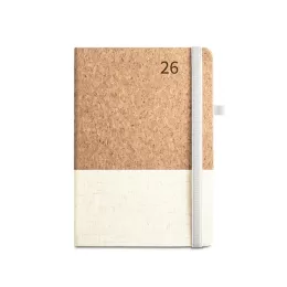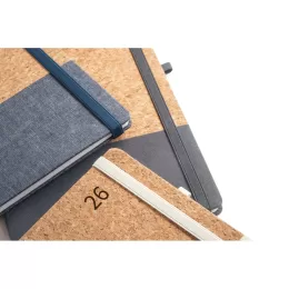 Agenda A5 em cortiça e linho. Com suporte para esferográfica e elástico para fecho na mesma cor. Fornecida com bolsa de non-woven. Esferográfica não inclusa. 148 x 210 mm | Bolsa: 205 x 250 mm