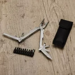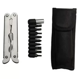 Alicate de metal retrátil com 21 funções. Possui: alicate normal/bico meia-cana, corta arame, lâmina grande, lâmina pequena, formão, abridor de garrafa, chave de fenda quadrada, serra, régua, lima, abridor de lata, adaptador e jogo com 9 pontas mais utilizadas(3 pontas de fenda, 3 pontas Philips e 3 pontas hexagonais). Acompanha bainha de nylon. Caixa fechada com 72 peças, vendas apenas de múltiplos.