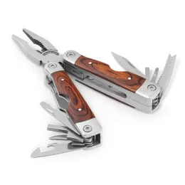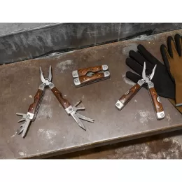 Alicate dobrável com ferramentas multifunções em aço inox e madeira, com 20 funções. Fornecido em bolsa em poliéster. 45 x 100 x 25 mm | Bolsa: 65 x 140 x 30 mm