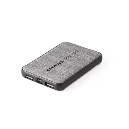 Bateria portátil 100% rPET, com bateria de lítio, capacidade de 5.000 mAh e entrada/saída de 5V/2A. Inclui uma porta para microUSB, uma porta USB-C e duas portas USB. Fornecida em caixa presente de papel craft. 65 x 98 x 10 mm