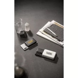Bateria portátil em ABS 100% reciclado. Tem capacidade de 10.000 mAh e tempo de vida ≥ 300 ciclos. Esta bateria portátil torna-se muito prática para o dia a dia, uma vez que permite, através do seu magnetismo, prender-se atrás dos dispositivos móveis. Incluso grip magnético extra para ser colocado nos smartphones que não têm magnetismo. Possui entrada/saída USB-C e potência máxima de 15W para carregamento rápido sem fios. Compatível com smartphones com tecnologia de carregamento sem fios. Incluso cabo USB-C para carregamento rápido. Fornecido em caixa presente de papel kraft reciclado. 100 x 64 x 18 mm | Caixa: 90 x 22 x 103 mm