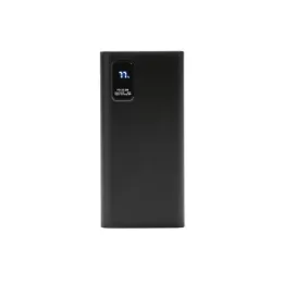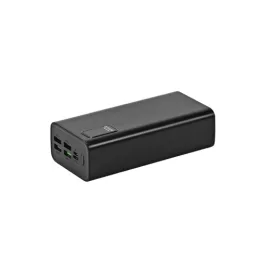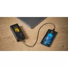 Bateria portátil em ABS 100% reciclado. Bateria em lítio com capacidade de 30.000 mAh e tempo de vida ≥ 300 ciclos. Possui entrada micro-USB e USB-C, 4 saídas USB-A e uma saída USB-C. A parte frontal tem uma tela de LED com informações do nível de carga da bateria. Incluso cabo USB-C para carregamento da bateria. Fornecida em caixa presente de papel kraft. 143 x 69 x 41 mm | Caixa: 75 x 150 x 45 mm