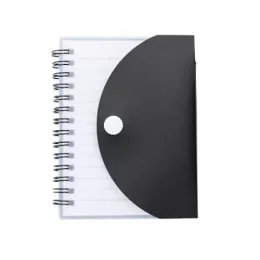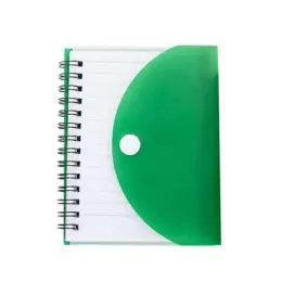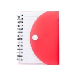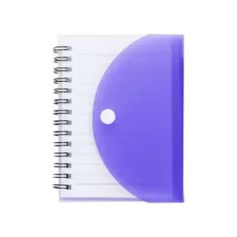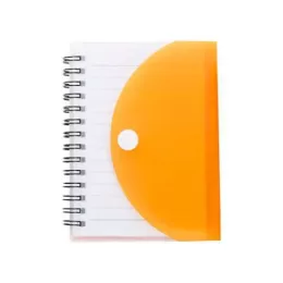 Bloco de anotações plástico com capa colorida e botão, possui espiral preto e parte interna transparente. Tem aproximadamente 66 folhas.