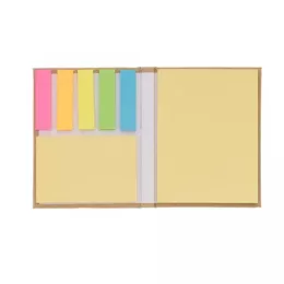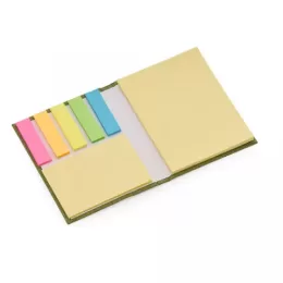 Bloco de anotações com capa dura, sticky notes e miolo sem pauta na cor amarela.