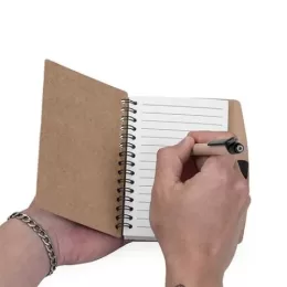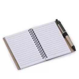 Descrição: Bloco de anotações ecológico com caneta. Possui espiral preto lateral e capa lisa frente e verso, aproximadamente 70 folhas brancas pautadas e última folha papelão branco. Possui suporte elástico com caneta papelão de clip e ponteira plástica. OBS.: PEDIDO MÍNIMO DE 60 PEÇAS!
