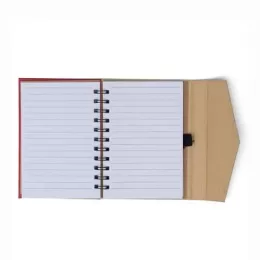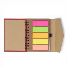 Descrição: Bloco de anotações ecológico com post-it e suporte para caneta. Bloco de capa colorida com abertura lateral imantada, primeira folha com cinco blocos autocolantes coloridos com aproximadamente 25 folhas e aproximadamente 68 folhas brancas pautadas. Ultima página kraft conta com suporte para caneta em nylon(não acompanha caneta).