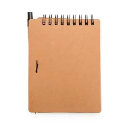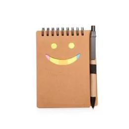 Bloco de Anotações Ecológico com Caneta de Papelão. Possui detalhe “smile” na capa frontal (verso liso), caneta ecológica com acabamentos em plástico acionada por clique, primeira folha(branca) com cinco blocos auto colantes coloridos com aproximadamente 20 folhas cada, bloco amarelo com aproximadamente 20 folhas e 70 folhas brancas pautadas.