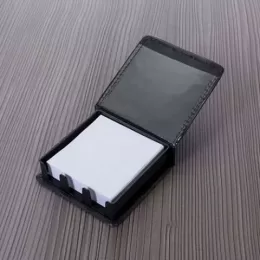 Bloco de anotações em couro sintético, suporte plástico para o bloco tem uma espécie de “dentes” frontal evitando que as folhas caiam, parte interna com bolso plástico e bloco de folhas brancas com aproximadamente 150 folhas.