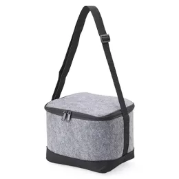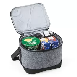Descrição: Bolsa térmica em tecido feltro com capacidade para 6 litros, possui revestimento térmico e acompanha alça transversal.