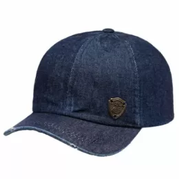 Boné 06 gomos, aba curva, confeccionado em jeans, frontal revestida com entretela inteligente, aba com puídos, frontal com aplicação em metal, ajustador em fivela de metal ouro velho.