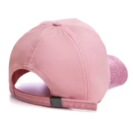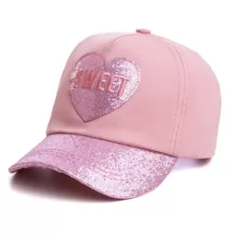Boné 06 gomos infantil, aba curva, confeccionado em sarja 100% algodão. Aba e aplique em tecido gliter, estampa frontal em patch fixado com o bordado, ajustador em fivela de metal prata velha.
