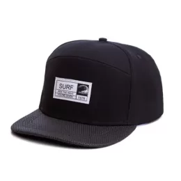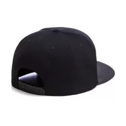 Boné six panel aba reta, confeccionado em lona 100% algodão, aba em pu furadinho, frontal revestida com entretela inteligente, estampa frontal com aplicação de patch em couro silkado fixado com o bordado, ajustador snapback.