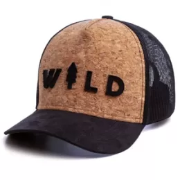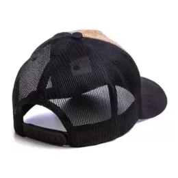 Boné trucker, aba curva, frontal em cortiça+tela. Aba em camurça, frontal revestido com entretela inteligente, estampa frontal com aplique de feltro duplo cortado à laser, fixado no bordado, ajustador snapback.