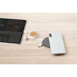 Cabo retrátil 5 em 1 em ABS e bambu. Uma das extremidades é USB-C com adaptador para USB-A, enquanto que na outra extremidade existe uma ponta especial 2 em 1 micro-usb e iOS com adaptador para USB-C. Entrada/saída: 5V/1A. Fornecido em caixa presente de papel craft. 170 x 185 x 75 mm