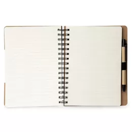 Caderneta ecológica com autoadesivos e caneta, com capa produzida em papelão kraft. Contém miolo com aproximadamente 70 folhas pautadas, suporte de nylon acompanhando, caneta de papelão com clip e ponteira de plástico com carga esferográfica 1.0mm e acionamento por clique. Bloco autoadesivo amarelo com aproximadamente 20 folhas, bloco verde com aproximadamente 20 folhas, cinco blocos coloridos autoadesivos com aproximadamente 20 folhas, 3 blocos coloridos com aproximadamente 20 folhas.