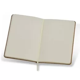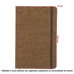Descrição: Caderneta em cortiça, possui marca página em cetim e elástico para lacre. Contém aproximadamente 80 folhas marfim sem pauta.
