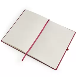 Descrição: Caderneta em couro sintético com marcador de página em cetim e fita elástica para fechar. Contém aproximadamente 80 folhas sem pauta.