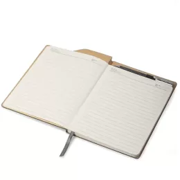 Descrição: Caderneta com capa dura em RPET (PET Reciclado), com porta caneta e marca página em cetim. Contém aproximadamente 80 folhas com pauta.
