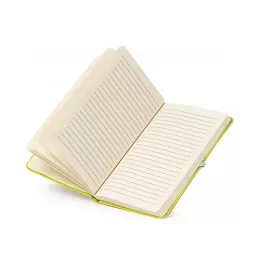 Descrição: Caderneta em couro sintético com porta caneta, marcador de página em cetim e fita elástica para lacre. Contém aproximadamente 80 folhas pardas com pauta.
