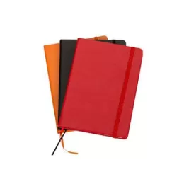 Caderneta tipo moleskine com frente e verso liso texturizado com marcador de página em cetim e elástico para fechar, possui aproximadamente 80 folhas amarelas pautadas.