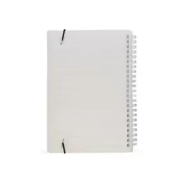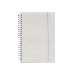 Descrição: Caderno A5 com capa plástica e elástico para lacre, contém aproximadamente 80 folhas marfim com pauta.