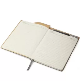 Caderno de anotações com suporte para caneta, capa dura em material reciclável, miolo com 80 folhas pautadas na cor bege. NÃO ACOMPANHA CANETA.