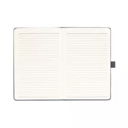 Caderno de anotações com suporte para caneta, capa dura almofadada em material sintético, miolo 80 folhas pautadas na cor bege.