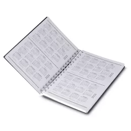 Caderno capa dura em percalux com 100 folhas, sendo elas 7 páginas iniciais com área para dados pessoais, calendário 2024/2025/2026, planejamento anual e trimestral.