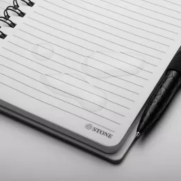 Descrição: Caderno de Anotações em plástico ABS, com wire-o metálico e suporte para caneta. Possui capa e caneta com textura que imitam pedra, suas folhas são impermeáveis e resistentes a rasgos. Contém aproximadamente 70 folhas brancas com pauta e elástico para lacre.
