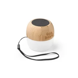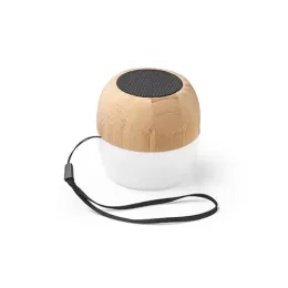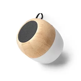 Caixa de som em bambu com pega em PP. Contém 3 diferentes luzes LED e transmissão sem fios BT v5.0 para se conectar ao seu dispositivo móvel. Possui uma potência de 3W, capacidade até 300 mAh e autonomia aproximada de 2 horas. Fornecido em caixa presente de papel kraft. Ø73 x 71 mm