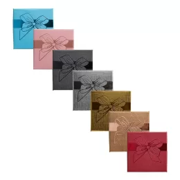 Descrição: Caixa para presente feita em papelão com acabamento levemente texturizado e laço decorativo em cetim colado na tampa. Conta ainda com berço removível em espuma com ranhuras.