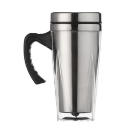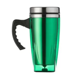 Caneca acrílica 450ml com fundo quadrangular com cabo plástico resistente, detalhes na tampa e compartimento interno de inox. Tampa rosqueável, possui compartimento que pode ser aberto para beber(não é térmica).