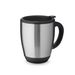 Caneca em aço inox de 450ml, alça de mão plástica, tampa com vedação ideal para chás e cafés.