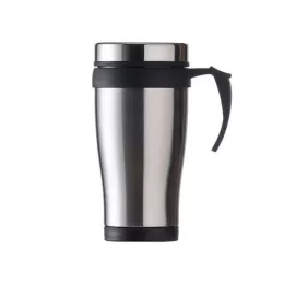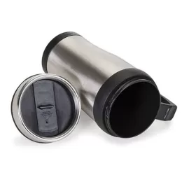 Caneca inox 400 ml com pegador e parte inferior plástica colorida. Tampa rosqueável, possui compartimento que pode ser aberto para beber(não é térmica).