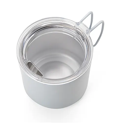 Descrição: Caneca Isotérmica 350ml parede dupla em Inox, com pegador de inox, contém tampa transparente com compartimento para beber.