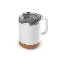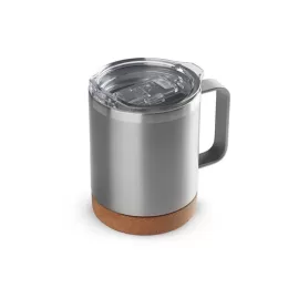 Caneca térmica em aço inox com parede dupla isolada à vácuo, tampa plástica e anel em silicone para vedação, alça lateal em inox na cor do produto, base em cortiça. Capacidade 350ml.
