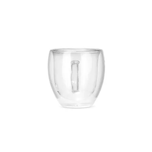 Caneca de vidro borossilicado com capacidade para até 150ml e estrutura de parede dupla, que ajuda a impedir o contato direto entre a temperatura do líquido e a parede externa da caneca.
