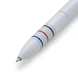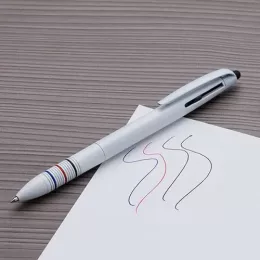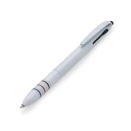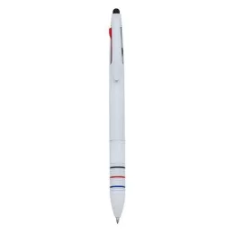 Caneta plástica três cores e ponteira touch, corpo branco com detalhes coloridos. Possui as cargas azul, preto e vermelho (basta descer o suporte colorido pra acionar a cor). Clip plástico e touch superior, possui anéis preto, vermelho e azul na parte inferior em relevo.