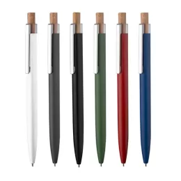 Descrição: Caneta em alumínio reciclado com carga esferográfica azul 1.0mm e acionamento de clique em bambu.