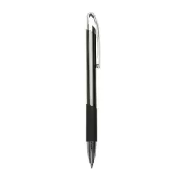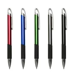 Caneta de metal colorida com detalhe emborrachado. Possui clip plástico prata brilhante, parte inferior com detalhe emborrachado preto com relevo. Aciona por clique.