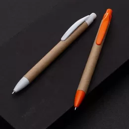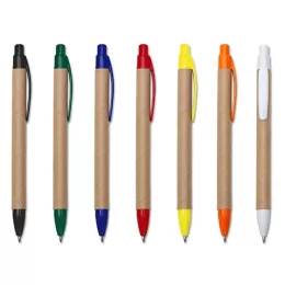 Descrição: Caneta ecológica de papelão com detalhes coloridos, o clip pode facilmente ser retirado para personalização no corpo da caneta. Clip e ponteira plástica, aciona por clique.