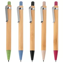 Descrição: Caneta com corpo em bambu e detalhes em plástico e metal. Aciona por clique. Acompanha estojo de papel.
