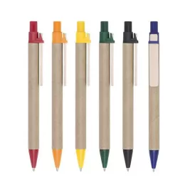 Caneta ecológica de papelão com detalhes coloridos. Clip de madeira e ponteira plástica, possui relevo na ponteira. Aciona por clique.