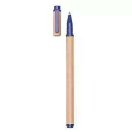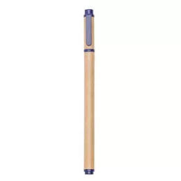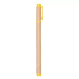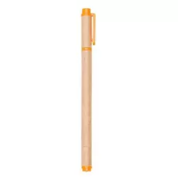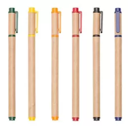 Caneta Ecológica Roller. Caneta de material kraft com tampa, possui clip plástico colorido, anel e parte inferior plástica colorida.
